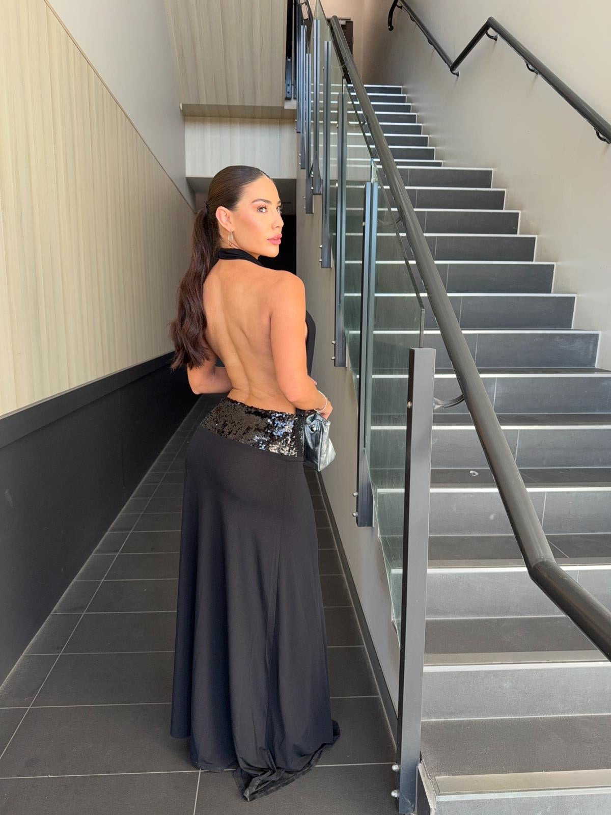 This halter black gown features a draped cowl-neck and an open back. The shimmering sequinned waistband sits low hugging the hips adding textural definition. The fluted skirt drapes asymmetrically, flowing beautifully as you