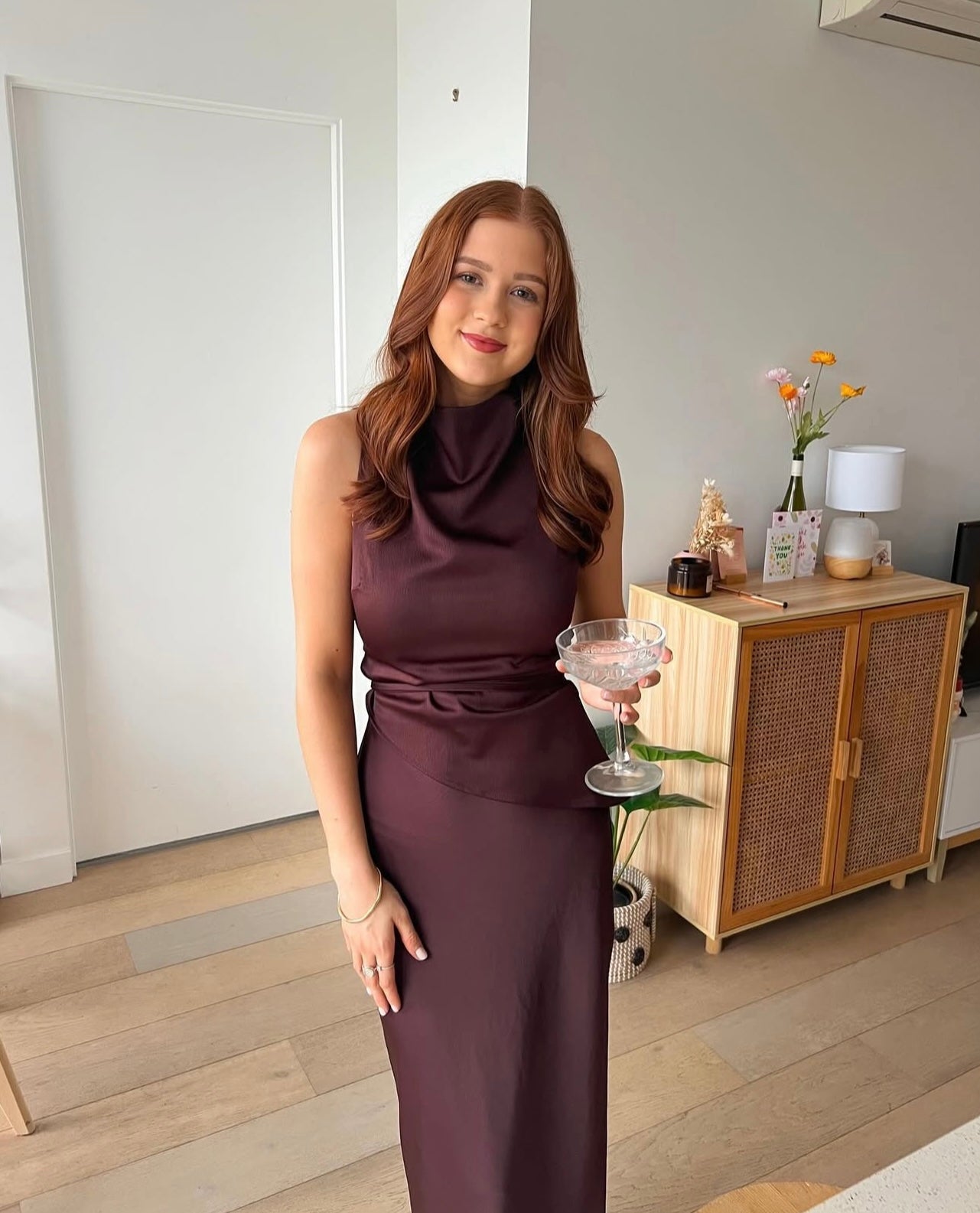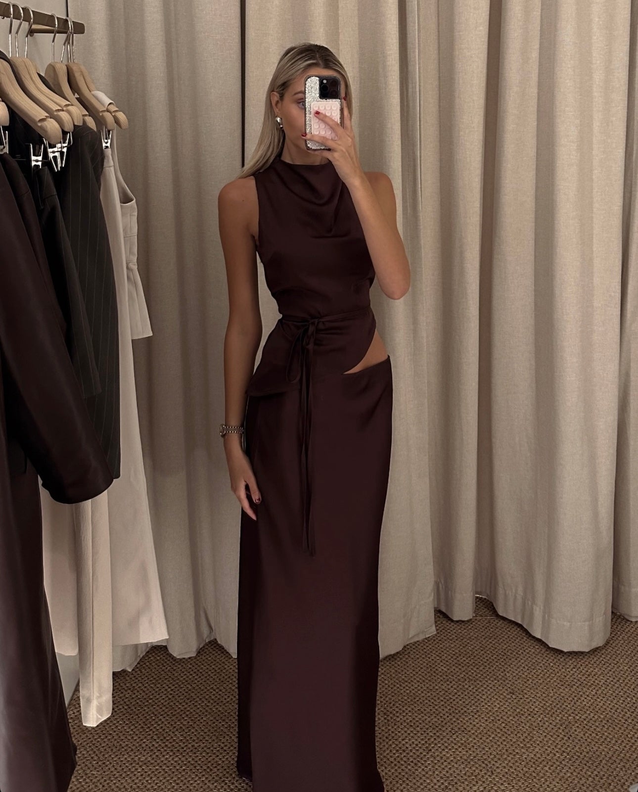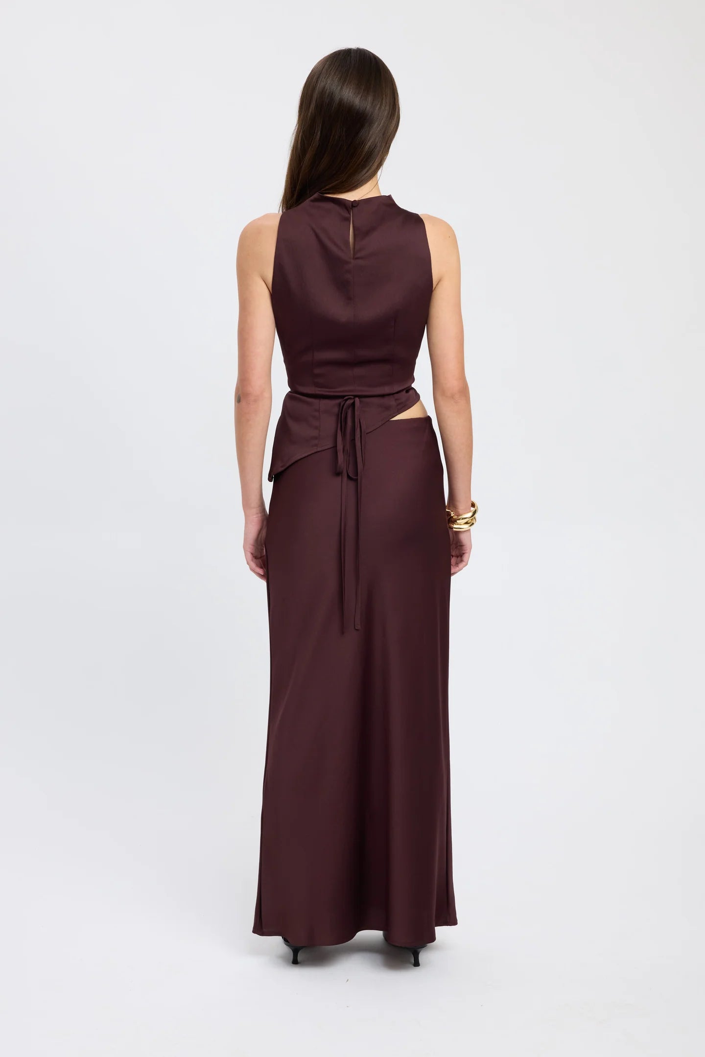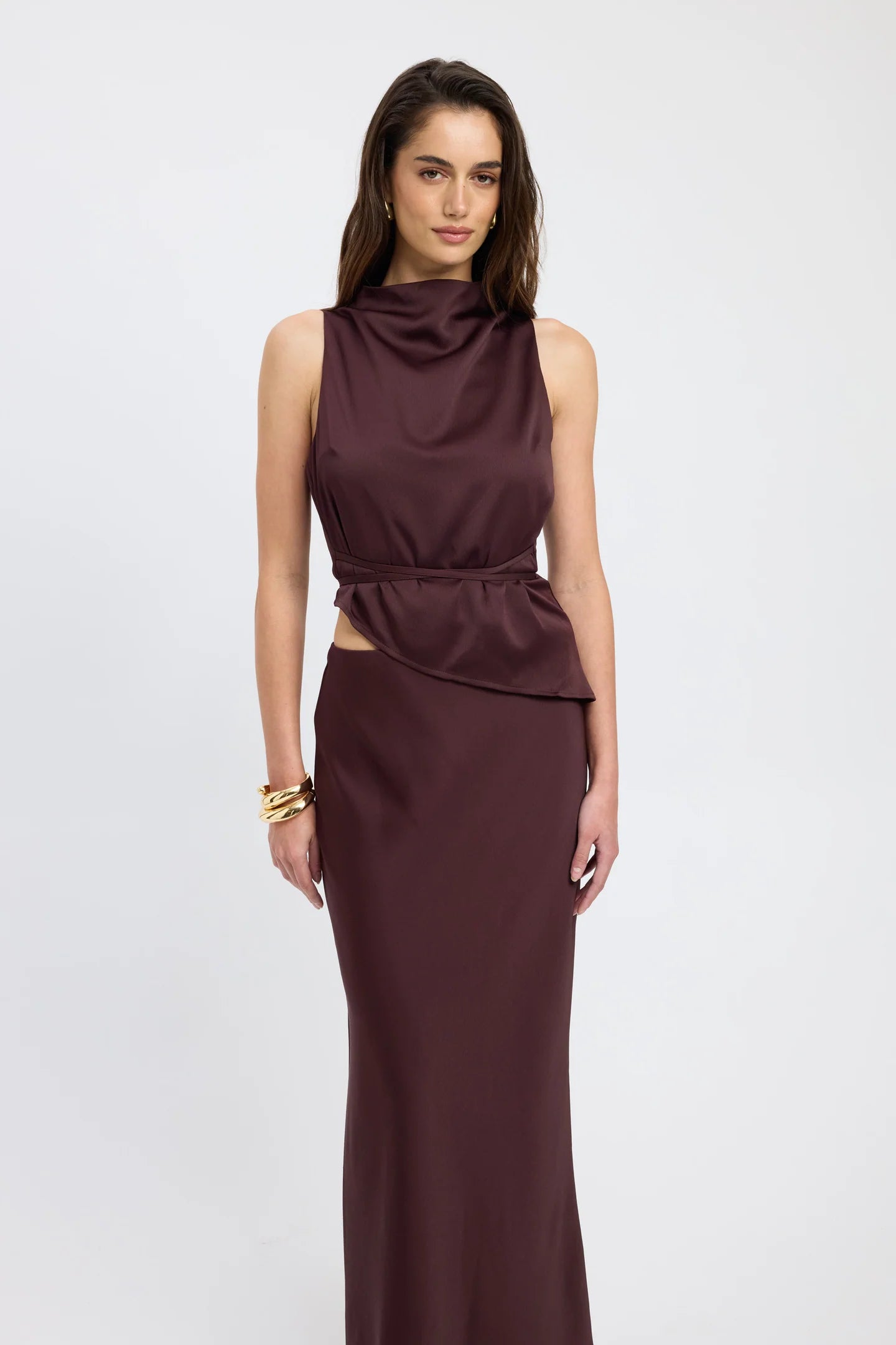 Elevate your look with the Prato High Cowl Neck in a rich mahogany colourway. This luxurious top features a sophisticated cowl neckline and an elegant asymmetric hemline. The tie around the waist allows for self styling, sinching the waist with its draped lightweight fabrication