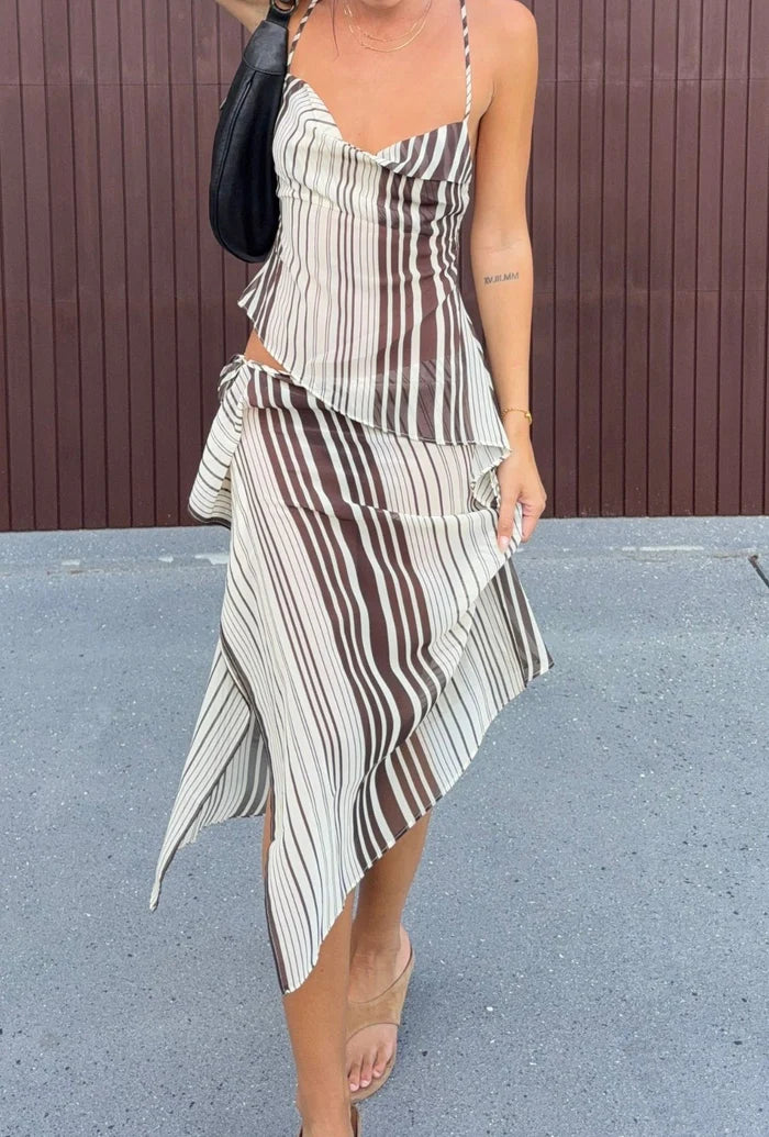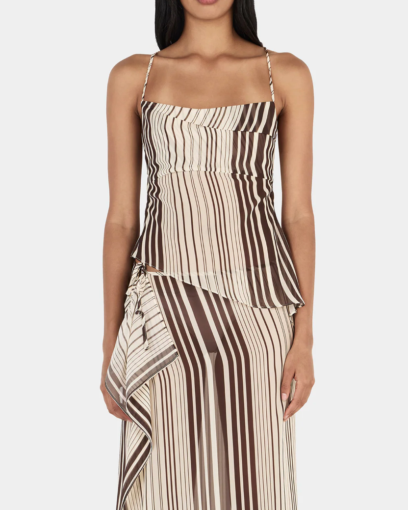 The José Top is a flirty, sheer top with an asymmetric hemline and a cowl neck detail. The top has adjustable tie straps and a bust frill. Pair with the matching Silverstone skirt for a complete set.