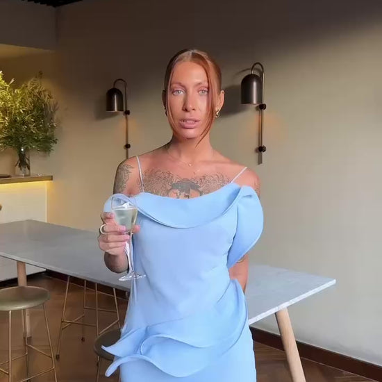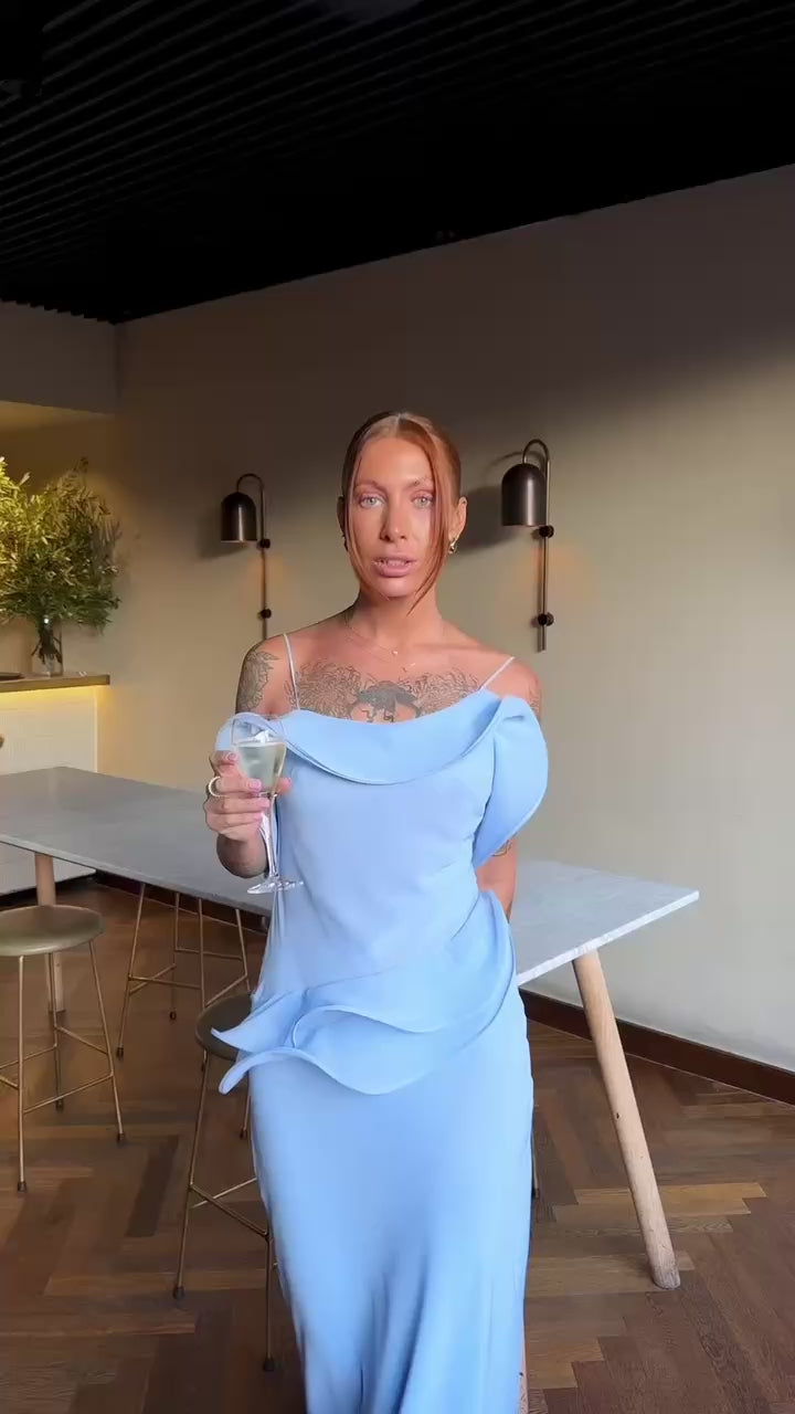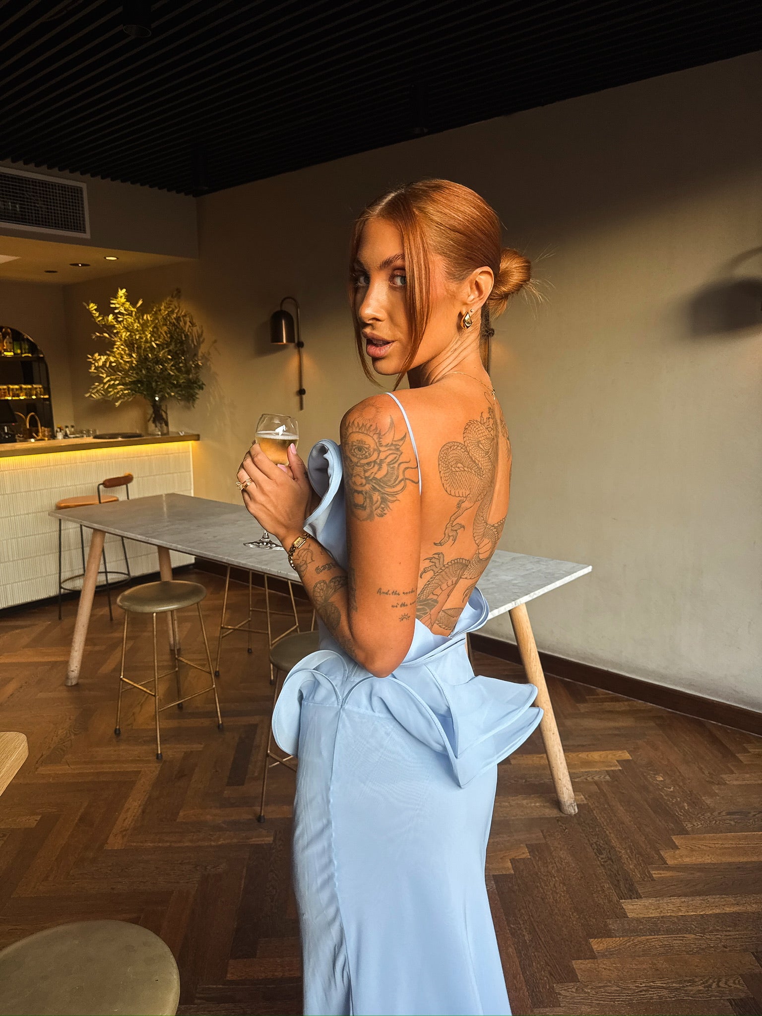 A floor-length chiffon design with a daring open back and delicate thin straps. Defined by its fluid silhouette and layered ruffleaccents
